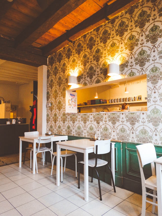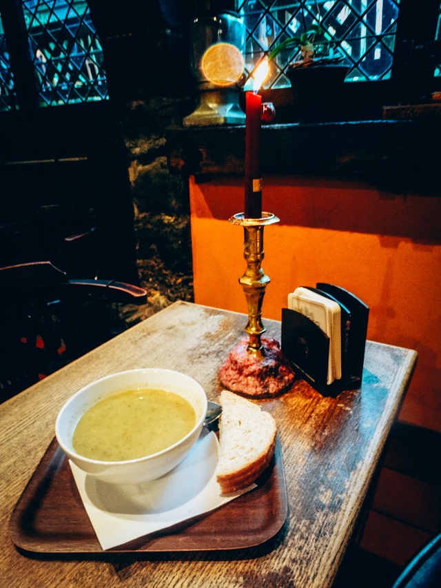 What better to do on a gray day in Belgium than find a local pub to enjoy some good beer and a hot bowl of soup? Another recommendation by the sweet woman who told us about Barista cafe was a pub called t’Gouden Mandeke. When you walk down the steps into this charming pub you feel like you’re stepping back in time. The dark wooden beams that stretch across the ceiling and the traditional Belgian decor that covers the walls make this pub the perfect place to sit and relax for an hour or two. We ordered a few beers from their wide selection on tap and enjoyed a bowl of 3 euro broccoli soup while we warmed our feet by the wood stove that blazed next to our table for two.