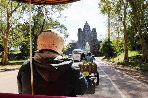 If you’re exploring Angkor Wat on your own and not with a tour group (like us) catch a tuk-tuk (local moto taxi) from Siem Reap, and negotiate a price to have the driver take you to the sites you want to see for the day. We paid about $15 for the day.