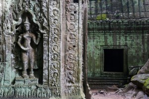 There is some upkeep of these temple grounds, but really the sites to see here are the enormous silk-cotton tree (Ceiba pentandra) and the smaller strangler fig (Ficus gibbosa) tree. The roots climb over the ruins and attach to the porous sandstone, extracting the water from the stones, looking like octopus legs climbing over the walls and doorways, giving Ta Prohm such a unique feel.